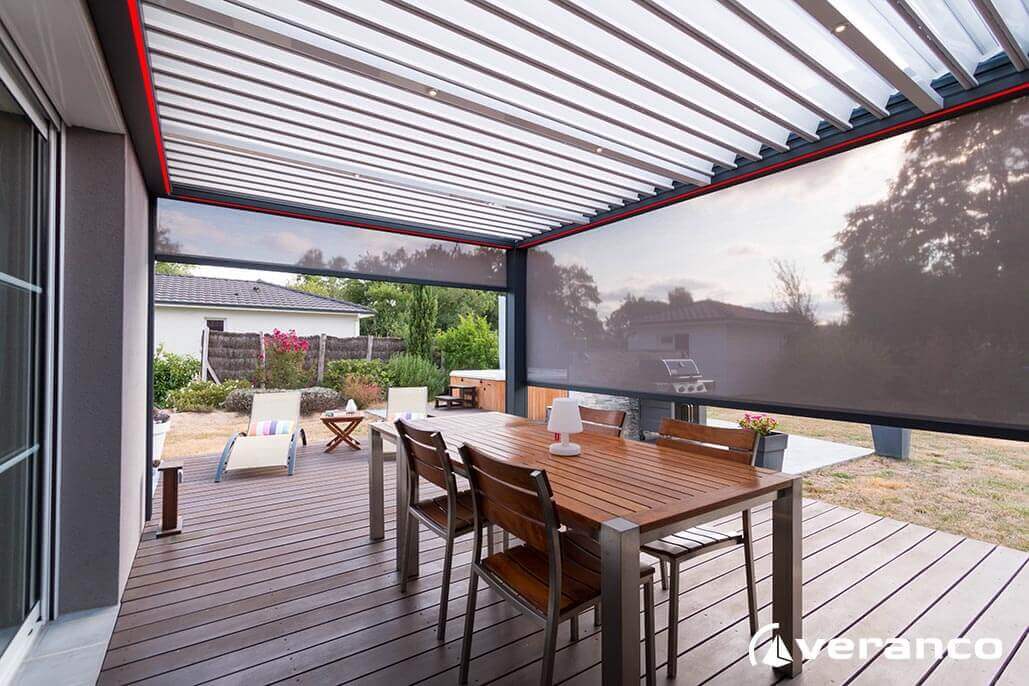 Les spots halogène ont une durée de vie très longue. Leur éclairage est qualifié de chaud, très proche de la lumière naturelle, et d’une grande efficacité. Store screen de toiture Store screen de toiture est une protection solaire de toiture spécialement étudiée pour la véranda OMBRALU. Elle vise 3 objectifs afin atteindre un degré de confort inégalé à l’intérieur de la pièce de vie, quelle que soit son orientation : une ventilation naturelle, une parade efficace aux nuisances solaires, un refroidissement des pièces surchauffées.