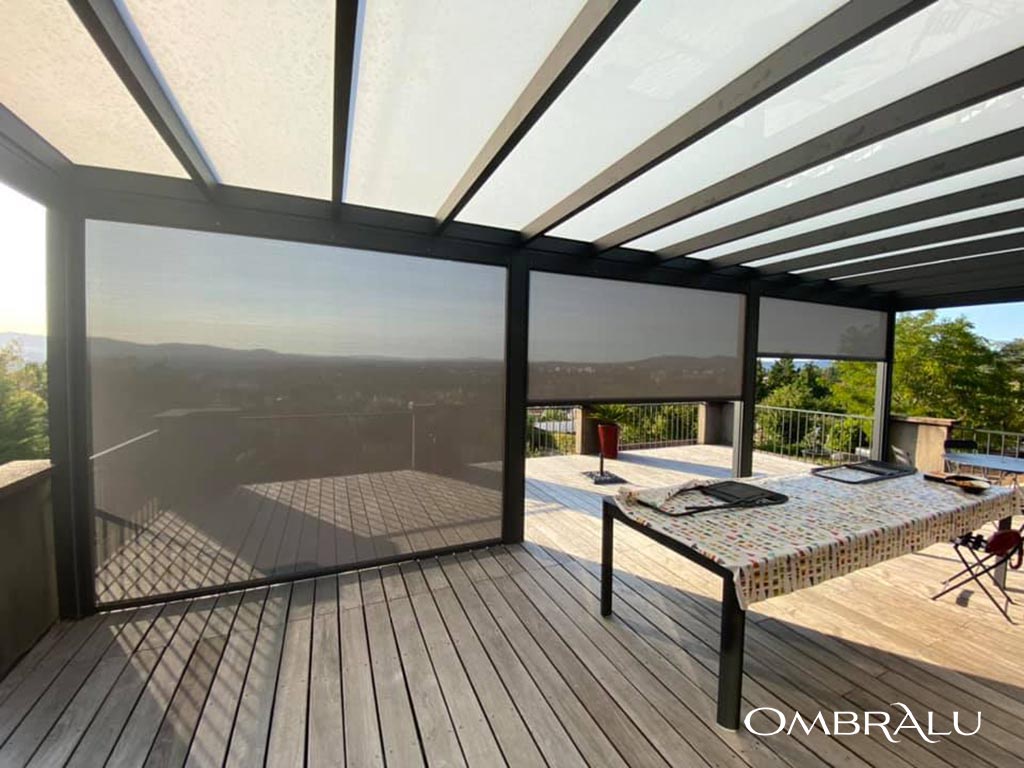 Store Screen est un système de protection solaire extérieur, vertical, avec moteur, anti-tempête et anti-insectes. Spécialement conçu et adapté à votre véranda OMBRALU, pour des baies vitrées jusqu’à 3,50 mètres de hauteur de 4 mètres de large (il peut être couplé jusqu’ 7, 2 m de large).