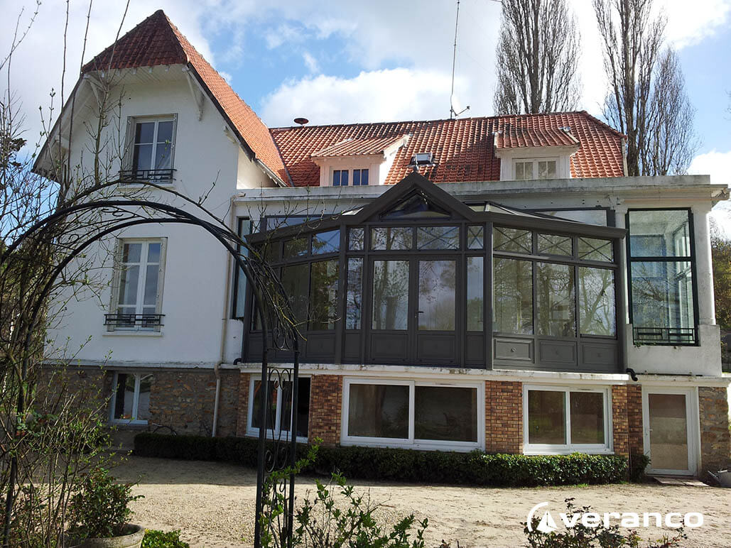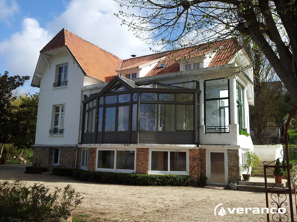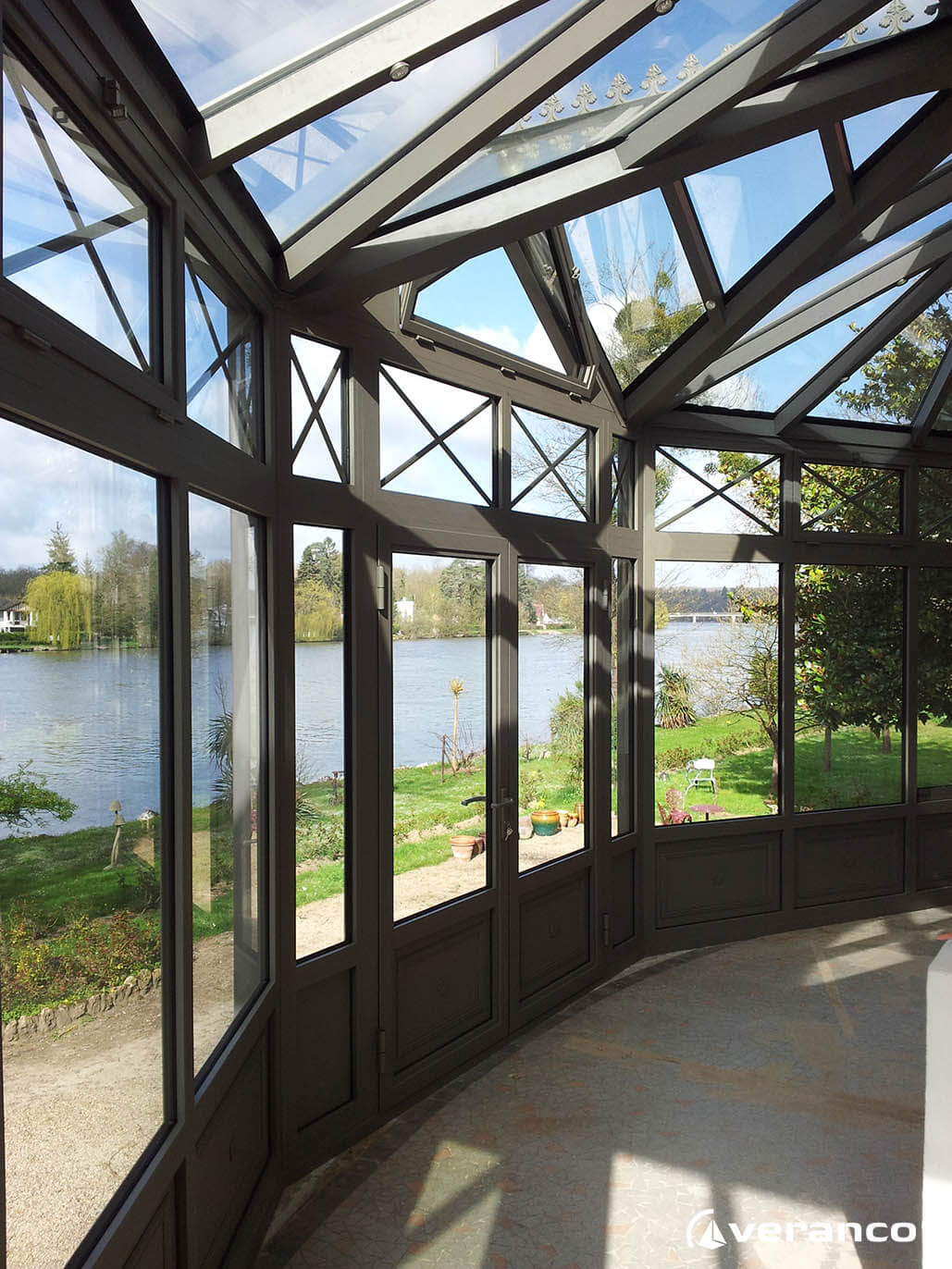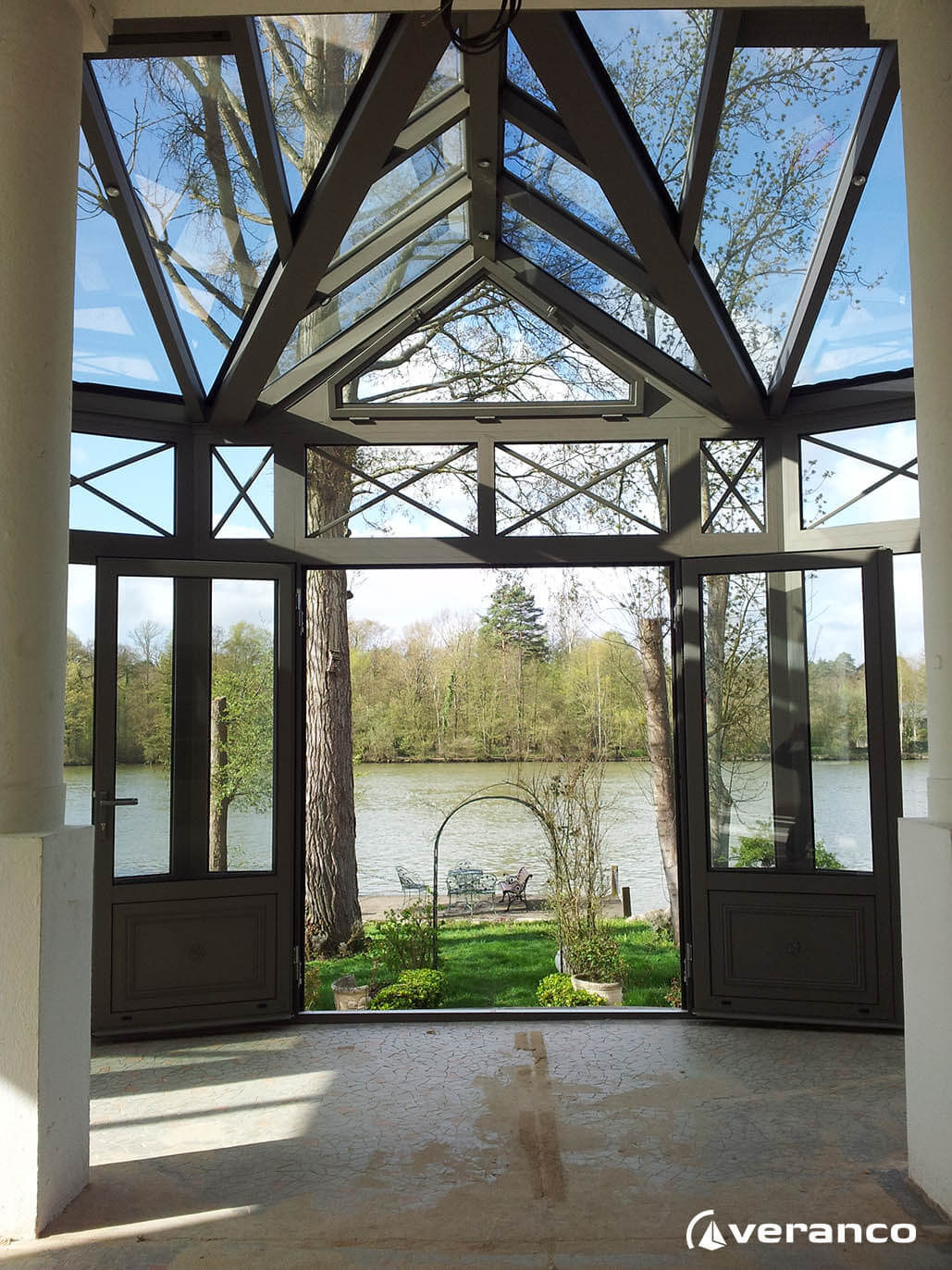 Volume, style et lumière pour une salle à manger de plain-pied dans la campagne. Cette magnifique véranda sur balcon ouverte sur la campagne offre aux occupants un cadre enchanteur, lieu de détente et de confort. Elle s'intègre parfaitement à son environnement.